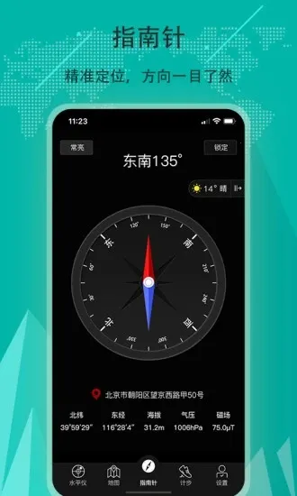 2. 功能丰富:除基本的指南针功能外,还有天气预报,提供全国所有地区的精准预报,涵盖温度、体感温度等关键数据;具备计步功能,可记录每日、每周、每月步数及热量消耗等;还有水平仪功能,能显示水平倾斜位置。