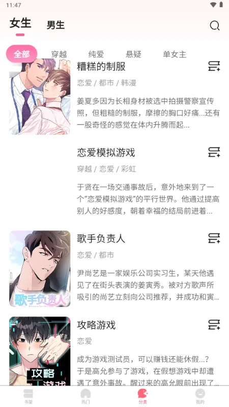 追耽漫画是耽美爱好者专属软件,有海量热门免费及宝藏纯爱漫画,涵盖真人、日漫、韩漫等多种类型,题材丰富。设有交流社区,部分功能免费部分付费,天天更新,满足多样口味,追漫轻松。