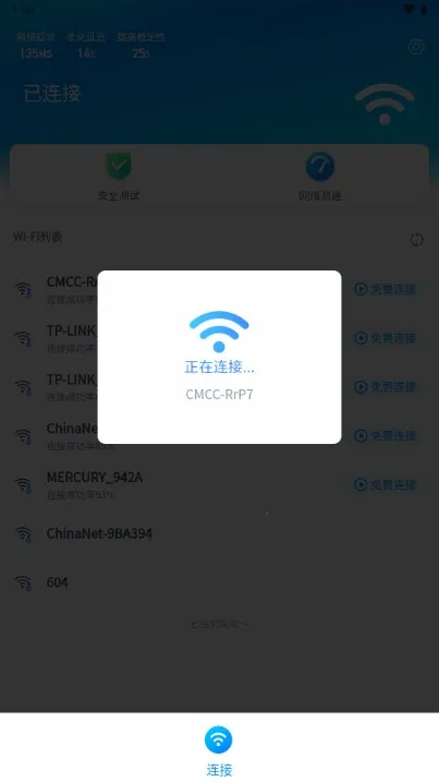 2. 智能贴心:可随时随地打开软件找附近可连网络,遇网络不佳能选信号增强,智能连接无需密码,还能完成专业测速。