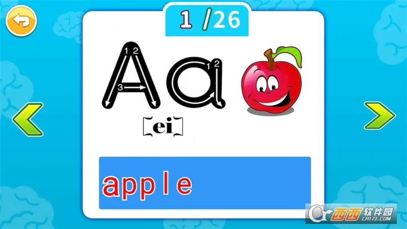 4. 进行A-Z 26字母学习,包括发音、书写、音标,还关联学习相关词汇,比如字母A关联学习Apple。
