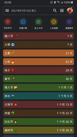 4、多样特色功能:有自定义日子封面和背景、精致节日节气封面列表、日期计算器、人生进度条、史上今日、大日子、手势和指纹解锁、主题切换、多种桌面小部件、日历查看等功能。