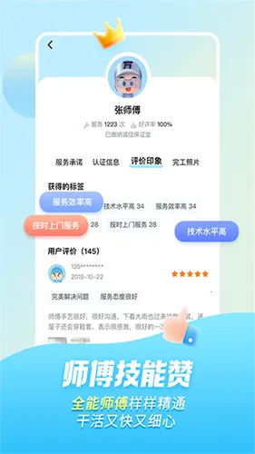 1. 师傅严选保障:师傅均经过100%实名认证与技能认证,还有服务保险,持证上岗,让您放心。
