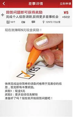 如果你想知道微差事的邀请码在哪里,别着急。微差事是一款超棒的任务众包与兼职服务移动应用平台。它能提供多种类型任务,像市场调研、产品体验、数据采集等,满足不同用户兴趣和时间安排。这里任务奖励透明,接单前就能清楚报酬金额。支持灵活时间,随时随地可参与。还有严格审核机制,保障任务真实可靠,界面简洁友好,操作便捷。玩法简单,注册完善信息后,浏览任务列表选感兴趣的报名,按要求完成提交审核,通过就能获报酬。其创新众包模式高效匹配企业需求与用户技能,结算系统高效,支持快速提现。定期有高奖励活动,数据安全有保障。有详细用户指南和客服支持,新手也能快速上手,能帮你利用碎片时间轻松赚取额外收入,快去试试吧。