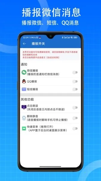 语音王播报是实用来电语音播报工具,集天气播报、来电显示、电量提醒等多项功能。操作简便,支持多种消息播报,有屏幕朗读功能,对视力不佳者友好,还能设置开机启动、声音大小等,界面简洁功能丰富。