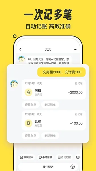 元元记账是手机记账软件,借助强大AI技术提供高效财务管理。支持语音、文字、手动记账,语音记账可录多笔消费自动生成账单并智能归类,还有资产管理、多账本等功能,满足多样记账需求。