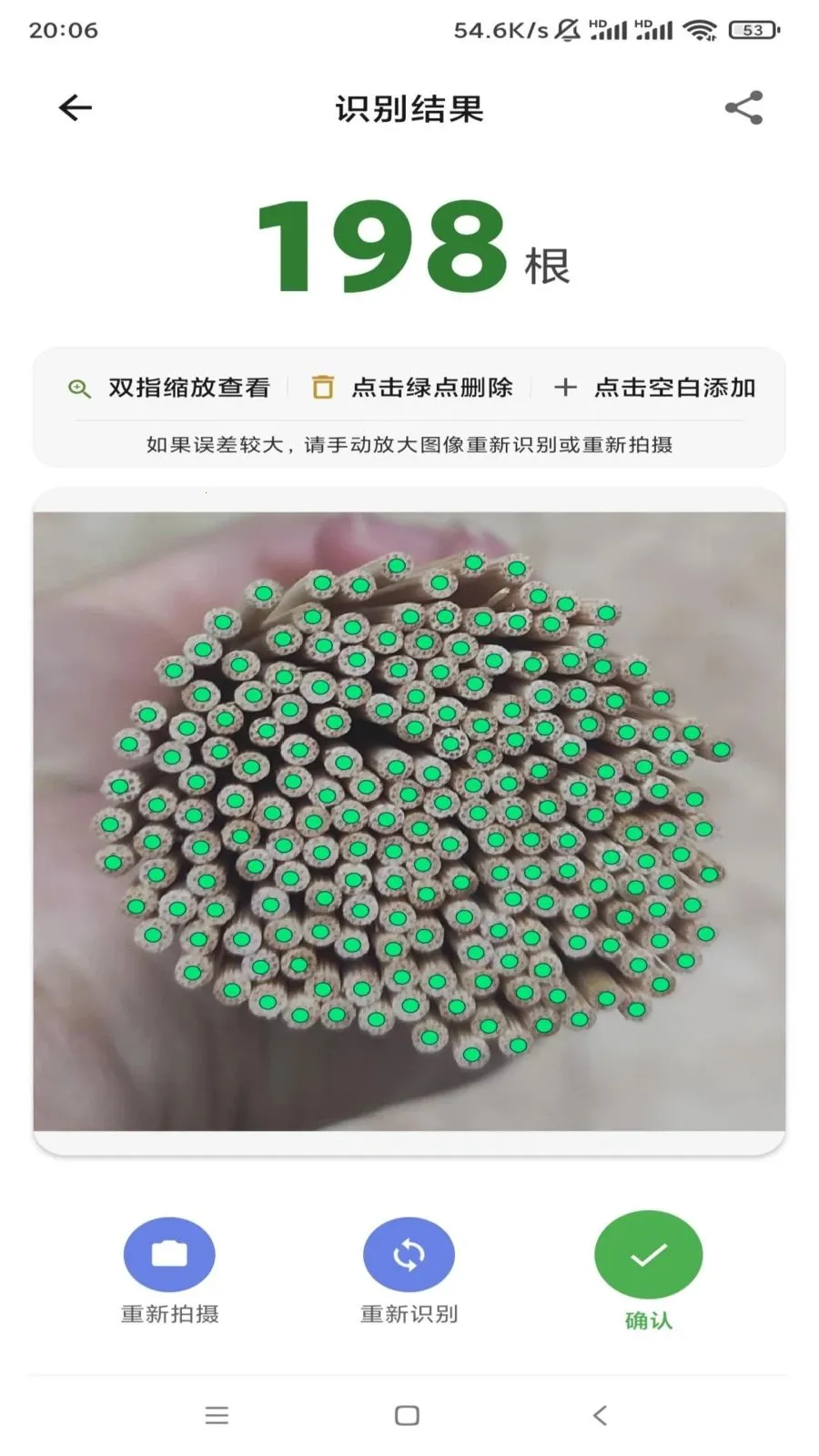 数签签功能强大又实用。它能拍照即数,对准签头拍张照,AI 自动识别计数,3 秒就能搞定,告别手动数签的麻烦。基于 AI 深度学习算法,准确率高达 99%,还能自动算价,输入每根签单价,自动算出总金额,结账更高效。支持手动校正识别结果,每笔识别记录自动保存,账目清晰可查。双指缩放可放大查看识别细节,确保每根签都数到。