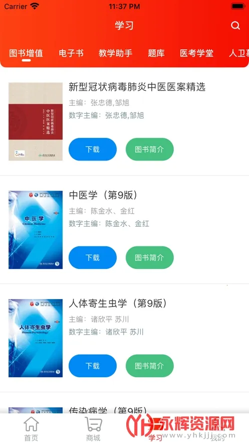 海量资源:整合医考学堂、电子书、增值服务、慕课、教学助手等多个APP功能,涵盖课程题库、电子书、医学文献等海量精品资源,覆盖西医药学、中医药等各个学科。