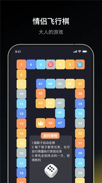 情侣飞行棋是一款专为情侣打造的趣味互动游戏。浪漫的氛围设计和独特的情侣规则,让游戏更加甜蜜有趣。它将传统飞行棋规则与情侣互动元素相结合,玩家与伴侣一同掷骰子、移动棋子、争夺终点并完成任务。游戏内设有多种模式,满足不同情侣的需求,简单易上手,能让情侣在互动中增进感情,分享喜悦与遗憾。快来与伴侣开启这场甜蜜刺激的飞行棋之旅吧。
