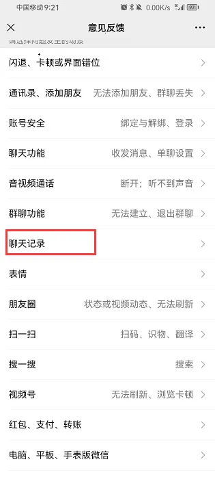 3. 点击下方的“意见反馈”,“聊天”也可以点进去了解一些聊天记录的处理方法。