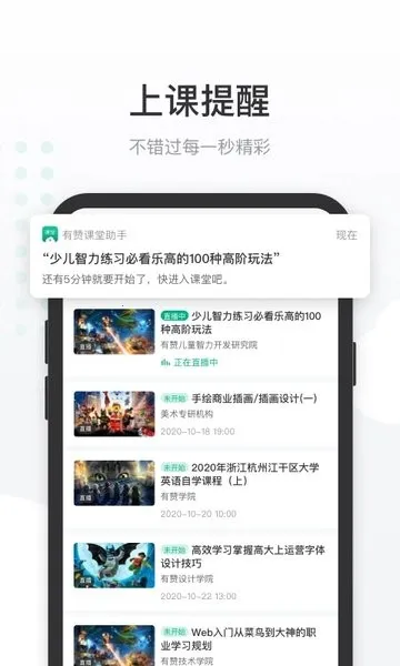 1. 上课提醒超贴心:能轻松管理已报名课程,直播开始前通过消息推送及时提醒上课,让你不错过每一秒精彩。