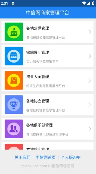 中信网商家管理(赛鸽信息平台)是专业赛鸽信息网,支持公棚、俱乐部等管理,可查公棚信息、发布赛鸽活动,有拍卖、百科等功能,覆盖全领域赛鸽信息,让用户便捷了解赛鸽资讯、参与竞拍。
