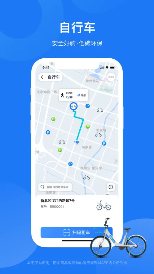 2. 借还车便捷:无固定车桩,可随时随地在任意公共停车区域借还车。