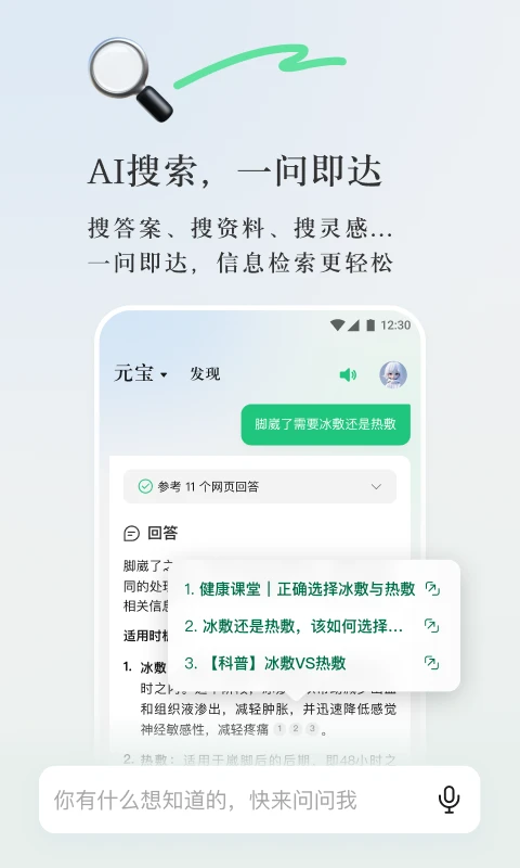 依托强大模型:元宝依托腾讯混元大模型,拥有强大的AI能力,能在办公、学习、创作、生活等多领域提供高效支持与生活辅助。