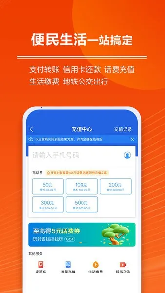 3. 便民服务:一站式搞定支付、转账、信用卡还款、话费、地铁公交出行等多项服务。