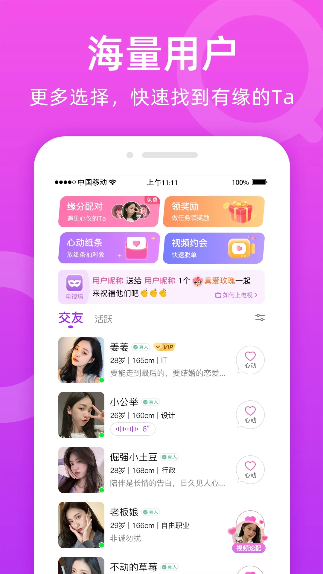这里功能超丰富,采用AI面容识别人工多层次审核,全方位保证交友聊天体验。能视频语音聊天,让你随时和感兴趣的对象畅所欲言。还能随意发表心情,感受大家的声音,改变沉闷社交现状。提供多种交友场景,像语音聊天、视频约会、家族群聊等,无论你喜欢哪种方式都能找到适合的。通过缘分配对能快速邂逅心仪之人,在心动纸条功能里还能和有缘人互动沟通。有了它,你可以放心与陌生人交流,享受不一样的社交新鲜感,赶紧来下载吧!