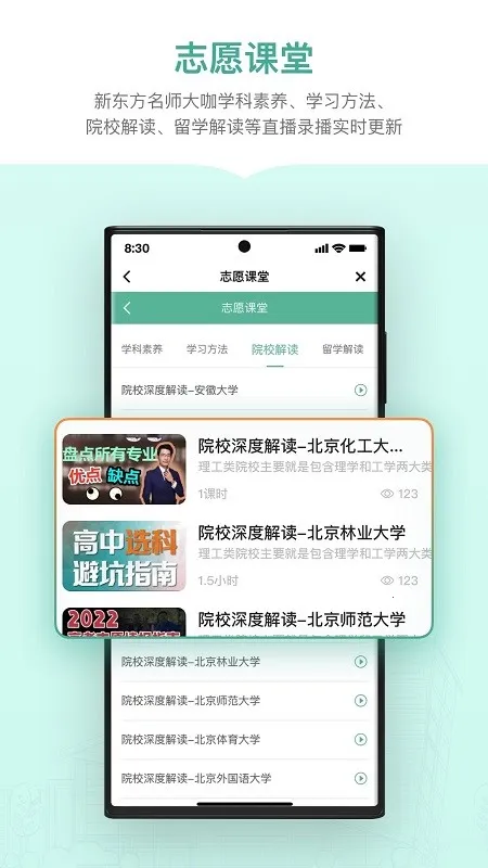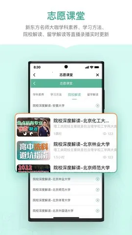 3. 志愿课堂丰富:有新东方名师大咖的学科素养、学习方法、院校解读、留学解读等课程,助考生全面了解院校与专业,更好制定升学计划。