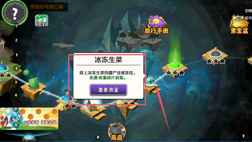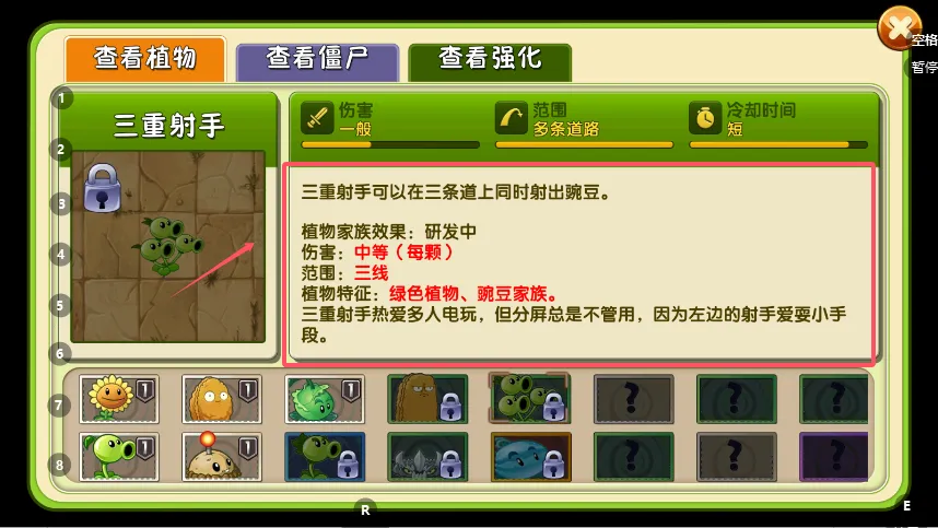 4、向下滚动或留意界面边缘,可以看到更多植物的预览图标,如“三重射手”,其中明确标注了其属性与状态。已解锁的可以随时查看详情。