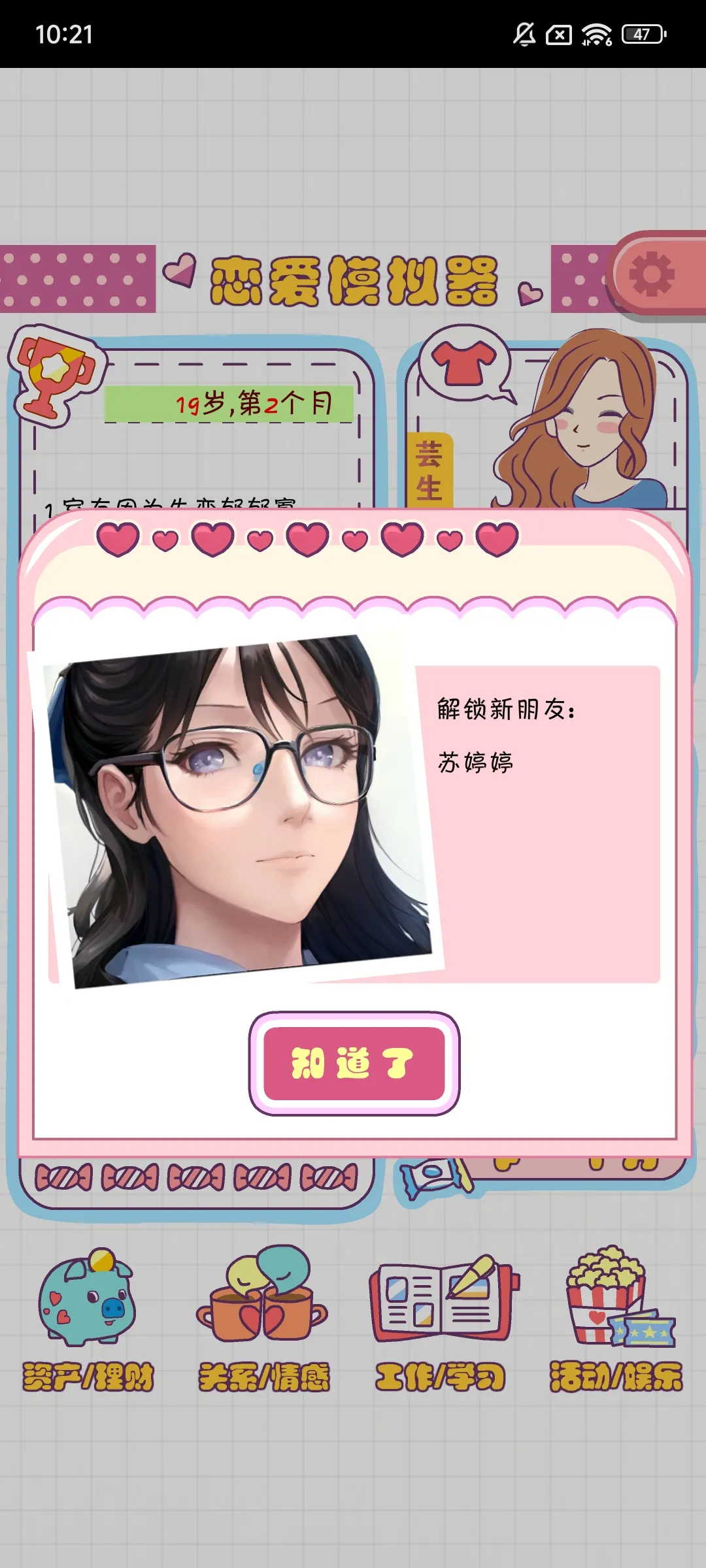 游戏玩法丰富,有真实的恋爱生活体验,人物设定、学习投入等都很贴近现实。剧情发展多元化,涵盖浪漫爱情、友情、家庭关系等。你可以自由选择喜欢的角色,与其进行情感交互,还能解锁不同角色和情感路线。通过学习、打工、投资等事件提升属性和资产,慎重赠送礼物提升好感度,开启专属桥段。能体验甜蜜关系,谨慎安排约会,每个阶段都有不同挑战。在这里,你能自由创造主角间的爱情,感受各种生活细节,开启娱乐圈的爱情冒险,沉浸在纯真美妙的恋爱世界里。