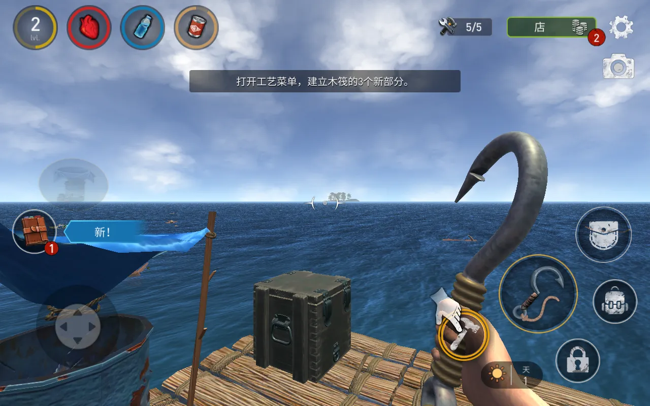 4**、** **建造升级**:注意木筏状况,不要让它生锈,可在高度和宽度上扩展木筏,还有很多升级帮助在海洋中生存,没有屋顶和墙壁的木板连在一起不安全,要打造更安全的住所。