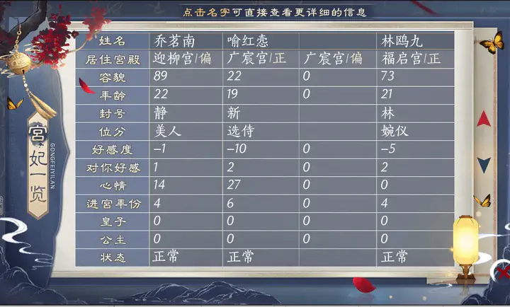 3. 真实模拟后宫:九千数值决定其他妃子,高度拟人化,她们有性格、属性、目标、心愿、喜好等,妃子间还有详细好感关系数值,带来最真实的宫廷历程。