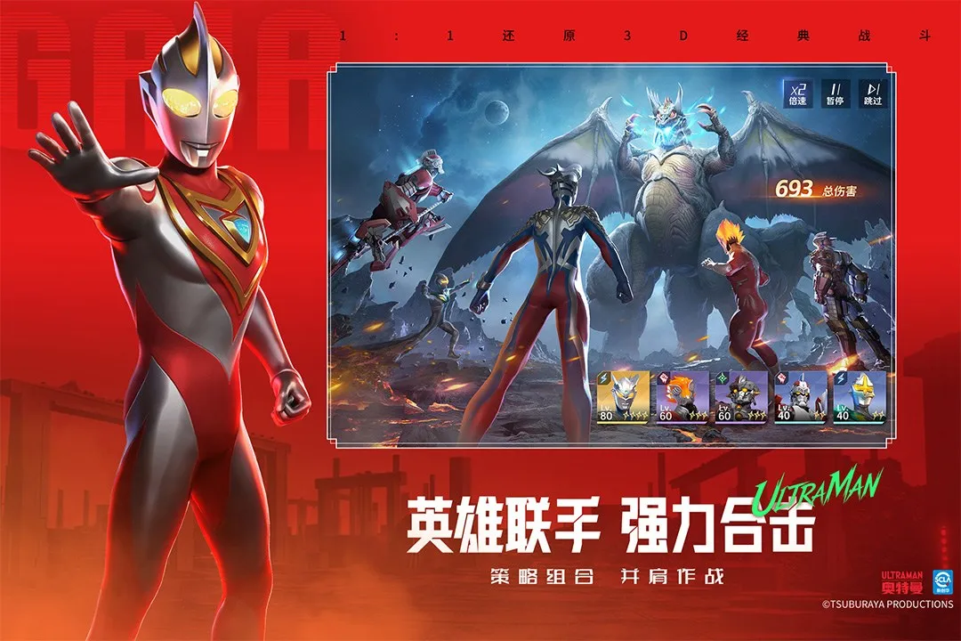 3. 跨越平成新生代与令和时代的奥特曼终极集结,角色外观与技能遵循原作设定,属性相克,可自由收集培养组建阵容。