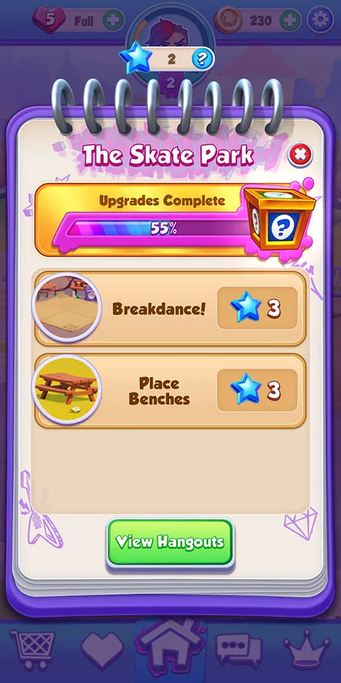 2. 装饰独特场所:探索并建造滑板天堂,通过消除格子解锁物品,装饰聚会场所,让其焕然一新。