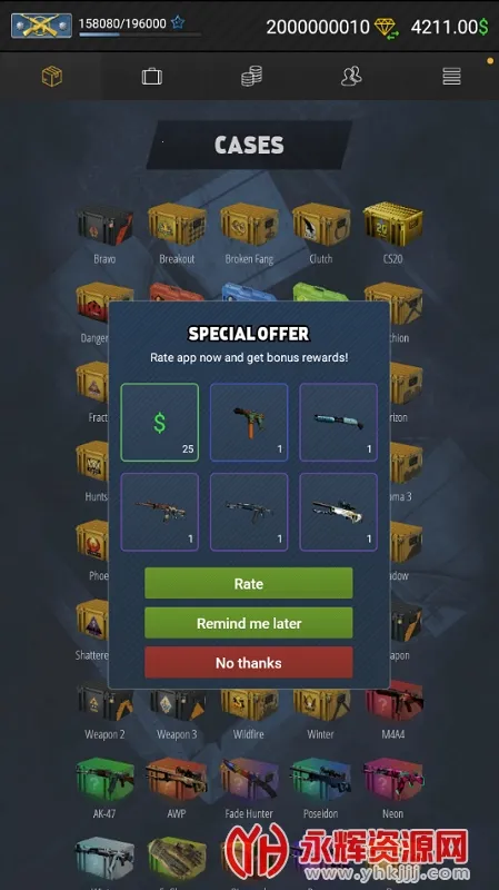 CaseOpener是一款基于CSGO的开箱模拟休闲游戏,高度还原开箱过程,有超1000种武器皮肤。模拟开箱几率与真实CSGO基本一致,可免费无限开箱,还有趣味小游戏、武器升级计划,画面精美,玩法简单易上手。