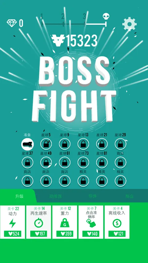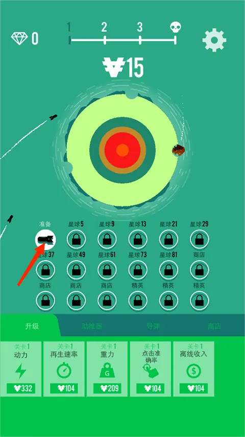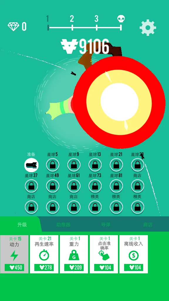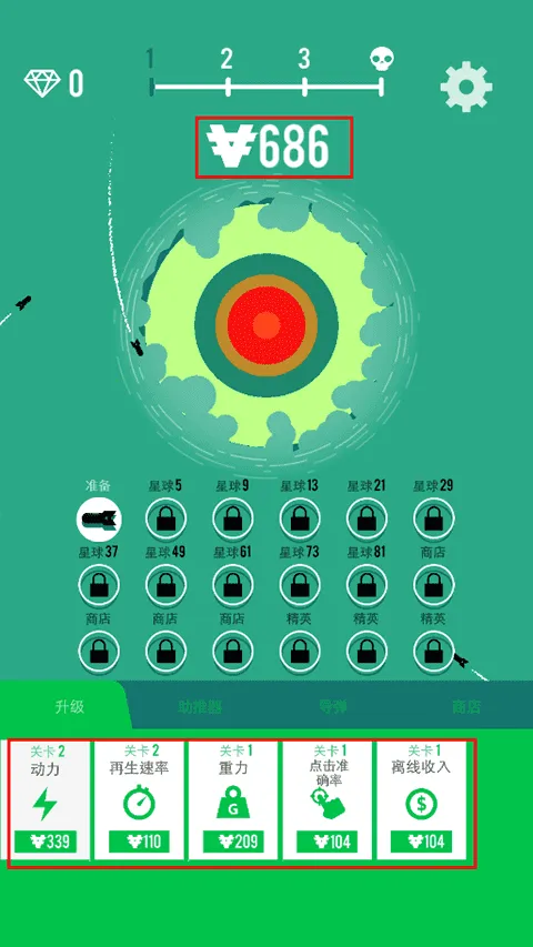 4、轰炸星球是会获取金币来升级动力、再生速率、重力等属性;