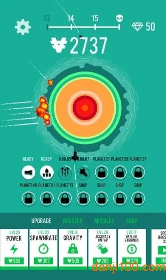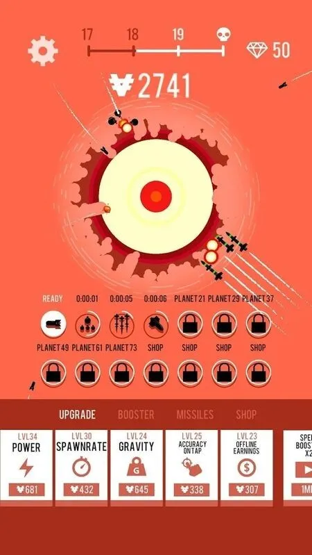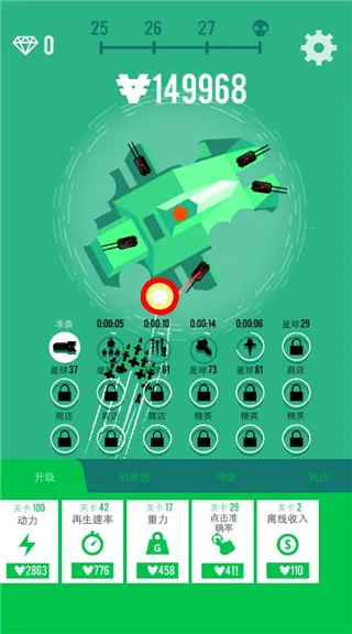 7、摧毁星球后我们可以获得金钱,我们可以点击进行升级轰炸的动力、再生速率、重力、点击准确率等等。