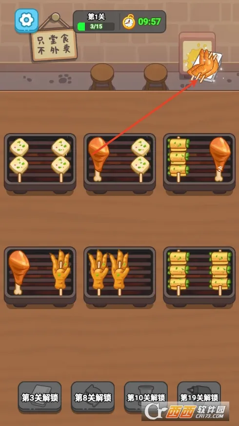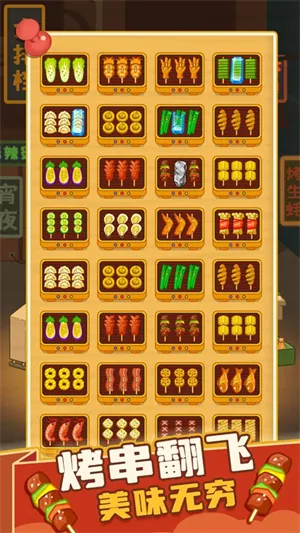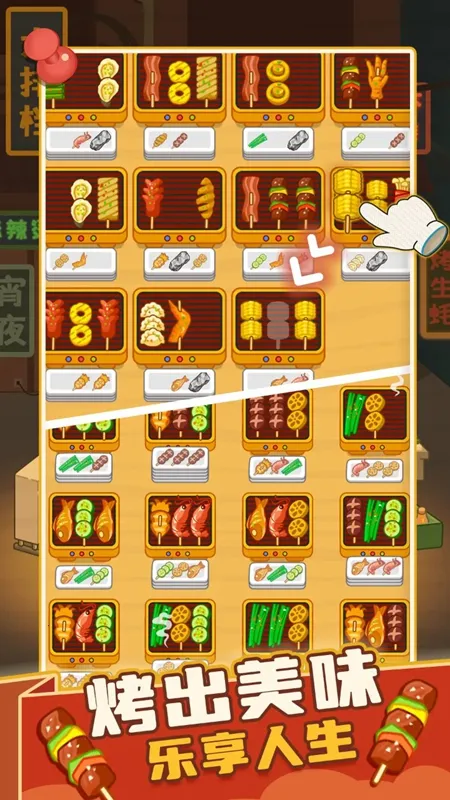 2、轻松有趣的操作:只需指尖轻点,拖动烤串,把相同的三根烤串摆放在一起即可消除,让烧烤火力全开,趣味无穷。